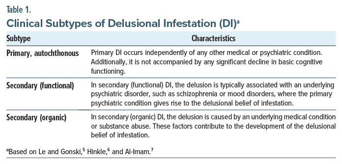 Delusional infestation (DI) is a psychiatric disorder characterized by self-induced cutaneous lesions. Patients maintain a persistent delusional belief that their body, particularly the skin, is infested with small pathogens, either living or non-living, despite a lack of dermatological or microbiological evidence.1–4 DI can present in various clinical forms, as classified by Le and Gonski5 and Hinkle.6 Table 1 outlines the 3 clinical subtypes of DI.