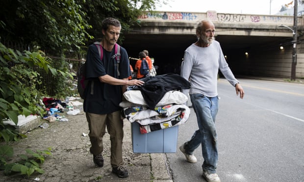 Jason Carmine, left, and his father Kevin Carmine, who say they both are addicted to heroin, carry their belongings from an encampment on Wednesday. Photograph: Matt Rourke/AP