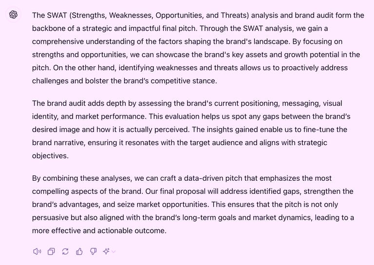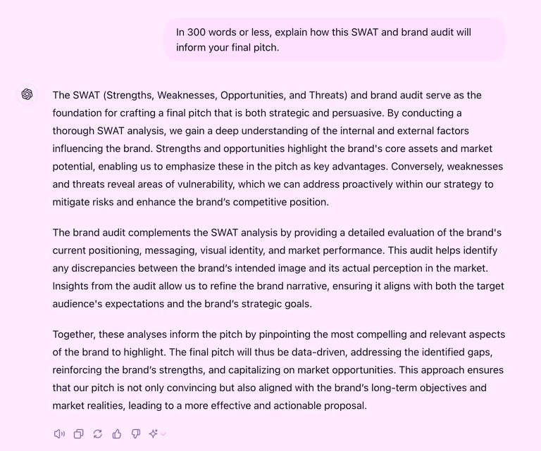 Take this prompt: In 300 words or fewer, explain how this SWAT and brand audit will inform your final pitch.