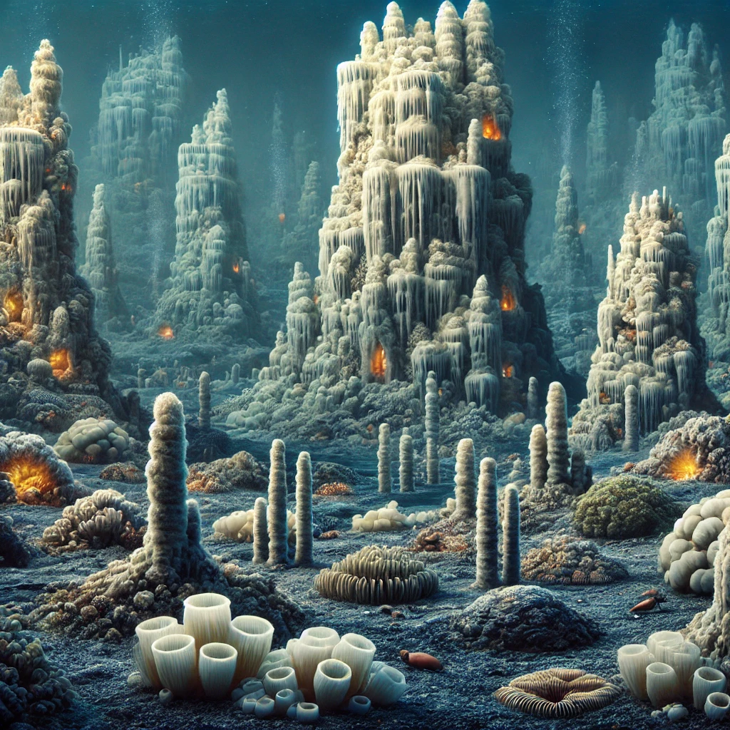 Here's a more detailed view of the Lost City Hydrothermal Field, now featuring thriving deep-sea life around the vents.